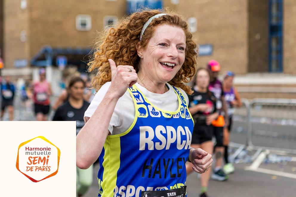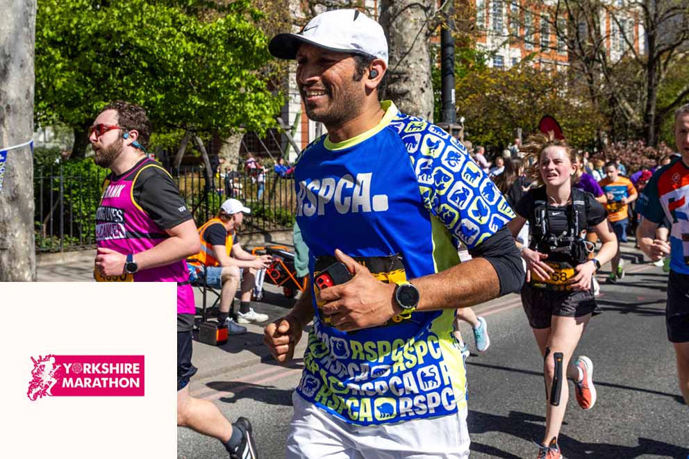 An RSPCA fundraiser wearing a white t-shirt and RSPCA running vest taking part in a charity running event.